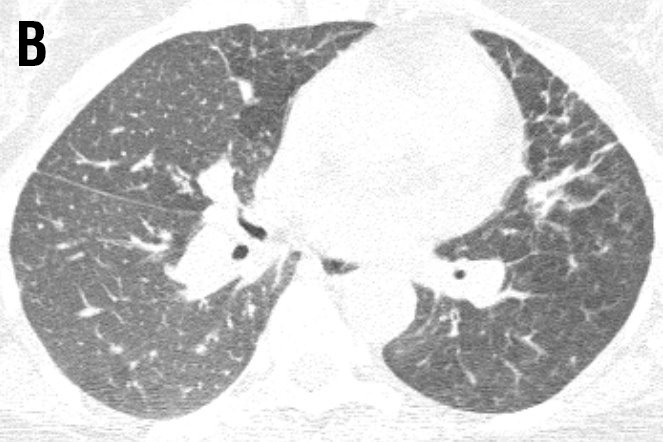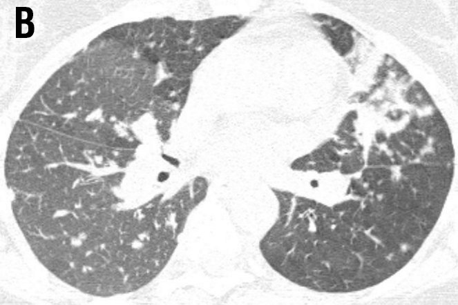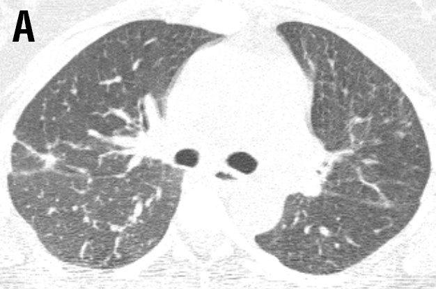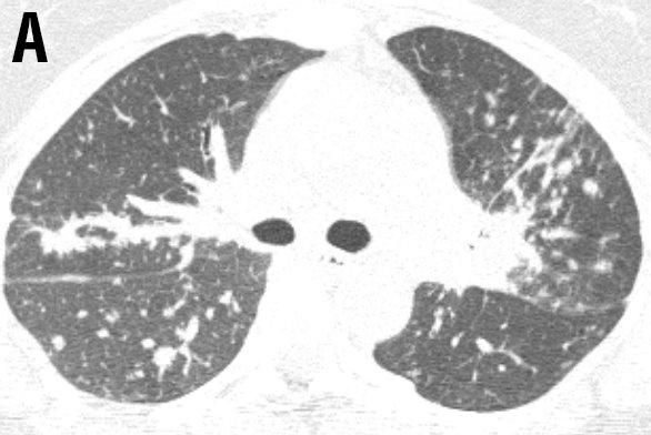 Laboratory tests were normal except the soluble IL-2-receptor was increased (3981 kU/L). The lung function test were abnormal. Therefore, adalimumab was started, initially 80mg and than 40mg once a week subcutaneously. Methotrexate was also continued (7.5mg once a week). After six months her fatigue and arthralgia were less prominent and her quality of life (QOL) improved a lot. The FEV1 was enhanced from 42% to 58% of predicted, the FVC from 77% to 92% of predicted and the DLCO from 75 to 79% of predicted. The six-minute walking distance improved from 600 to 630 meters. More important, before the treatment she desaturated to 82%, and this did not happen anymore the last time she was tested. The HRCT also improved (figure 2 a and b) [5,6].