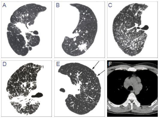 Figure 3 HRCT findings in sarcoidosis adapted from Oberstein et al.[5], visual score. A Thickening or irregularity of the bronchovascular bundle (BVB). B Parenchymal consolidation (including ground-glass opacifications). C Intra-parenchymal nodules. D Septal and nonseptal lines (1→); BVB (2→). E Focal pleural thickening (arrows). F Enlargement of the lymph nodes.