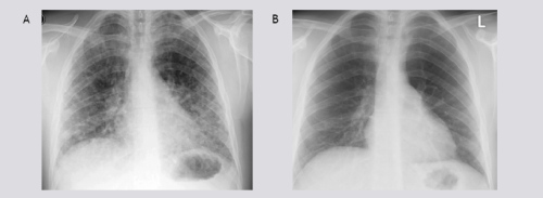 Figure 1 A) Chest radiograph at admission shows parenchymal lung opacities; B) Two weeks after admission, normalized.
