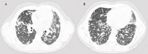 A 22-years old male presented with dyspnea, non-productive cough, myalgia and fever. These symptoms started 4 days prior to admission. His medical history was unremarkable. He smoked tobacco for a few years. Finally, he admitted alcohol abuse, heavy marijuana and cocaine smoking in the last months. Physical examination revealed some crackles at auscultation, he was a little tachypnoeic (20 breaths•min–1) and his body temperature was 36.8°C. He had a moderate hypoxemia (pO2 8.7kPa, breathing room air), high serum C-reactive protein (254 mg/l), a white blood cell count of 16.3 109•L–1 and a normal number of eosinophils. Figure 1 shows his chest roentgenogram demonstrating diffuse infiltrates at presentation. Figure 2 shows his high resolution CT (HRCT) scan with a diffuse reticulonodular pattern ad admission. Spirometry two days after admission showed normal dynamic lung volumes with slightly decreased diffusing capacity (81% of predicted).