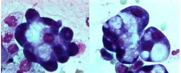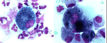Figure 3 A) May-Grünwald Giemsa stained cytocentrifuged; B) Reactive type II pneumocyte (PII cell). BALF sample showing alveolar macrophages (AMs) containing phagocytised material. Magnification 1000x.