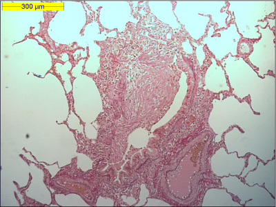 Figure 2a Lung tissue specimen showing the presence of granulation tissue plugs within the lumen of a small airway.